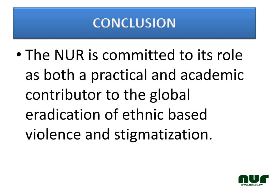 CONCLUSION • The NUR is committed to its role as both a practical and academic contributor to the global eradication of ethnic based violence and stigmatization.
