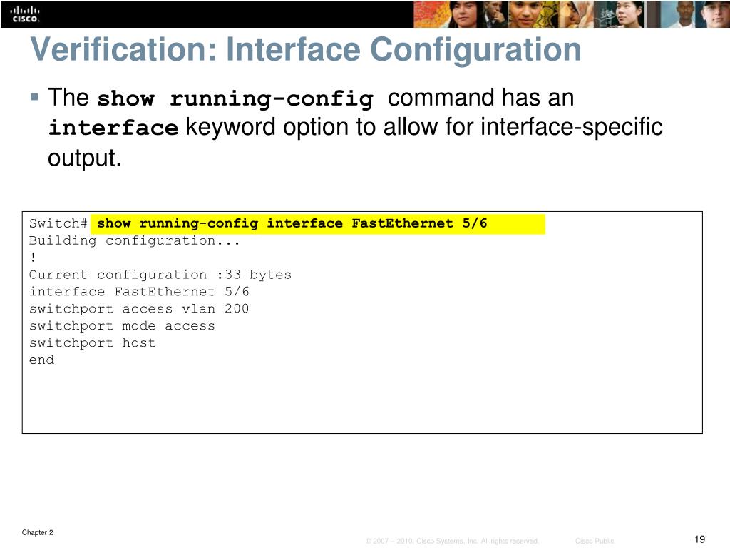 Verification: Interface Configuration • The show running-config command has an interface keyword option to allow for interface-specific output. Switch# show running-config interface FastEthernet 5/6 Building configuration... ! Current configuration :33 bytes interface FastEthernet 5/6 switchport access vlan 200 switchport mode access switchport host end