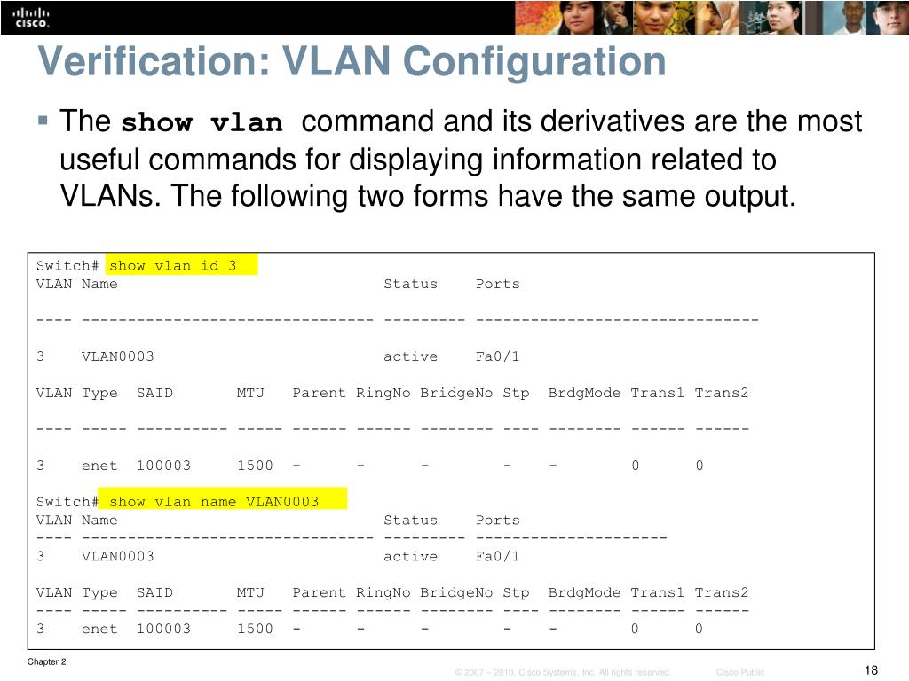 Verification: VLAN Configuration • The show vlan command and its derivatives are the most useful commands for displaying information related to VLANs. The following two forms have the same output. Switch# show vlan id 3 VLAN Name Status Ports ---- -------------------------------- --------- ------------------------------- 3 VLAN0003 active Fa0/1 VLAN Type SAID MTU Parent RingNo BridgeNo Stp BrdgMode Trans1 Trans2 ---- ----- ---------- ----- ------ ------ -------- ---- -------- ------ ------ 3 enet 100003 1500 - - - - - 0 0 Switch# show vlan name VLAN0003 VLAN Name Status Ports ---- -------------------------------- --------- --------------------- 3 VLAN0003 active Fa0/1 VLAN Type SAID MTU Parent RingNo BridgeNo Stp BrdgMode Trans1 Trans2 ---- ----- ---------- ----- ------ ------ -------- ---- -------- ------ ------ 3 enet 100003 1500 - - - - - 0 0