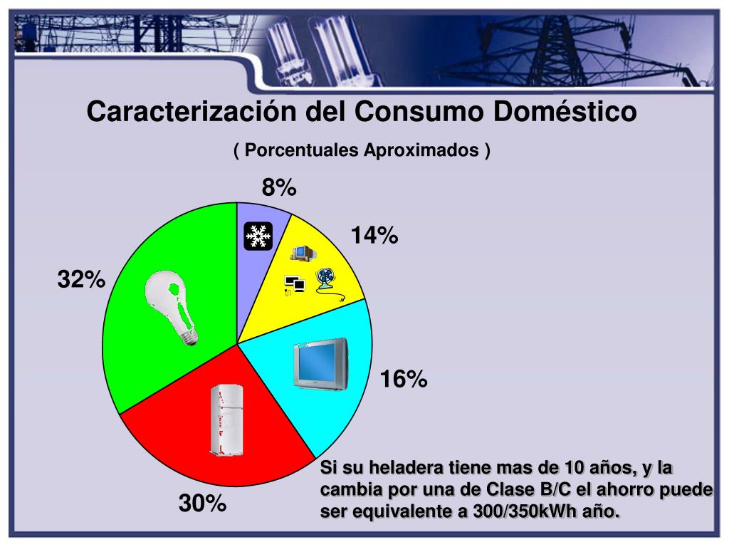 Caracterización del Consumo Doméstico ( Porcentuales Aproximados ) 8% 14% 32% 16% Si su heladera tiene mas de 10 años, y la cambia por una de Clase B/C el ahorro puede ser equivalente a 300/350kWh año. 30%
