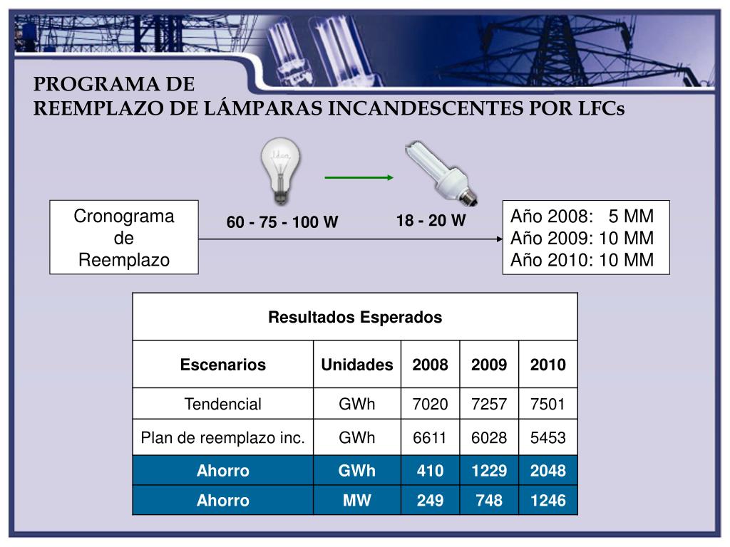 PROGRAMA DE REEMPLAZO DE LÁMPARAS INCANDESCENTES POR LFCs Cronograma de Reemplazo Año 2008: 5 MM Año 2009: 10 MM Año 2010: 10 MM 18 - 20 W 60 - 75 - 100 W