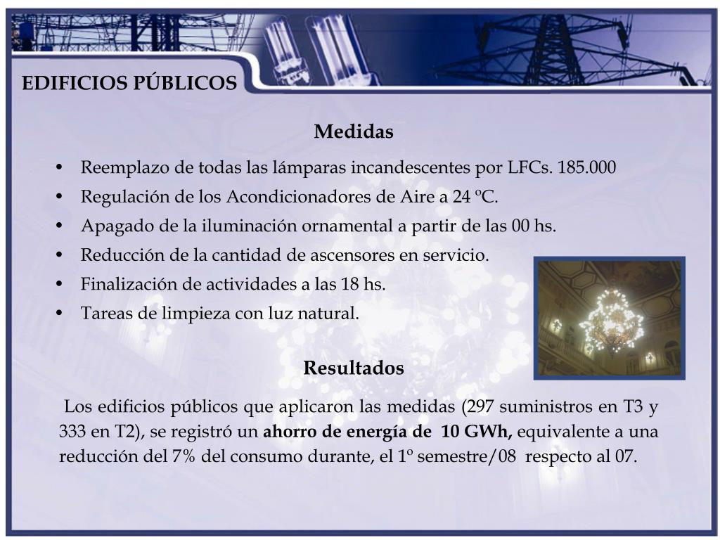 EDIFICIOS PÚBLICOS Medidas • Reemplazo de todas las lámparas incandescentes por LFCs. 185.000 • Regulación de los Acondicionadores de Aire a 24 ºC. • Apagado de la iluminación ornamental a partir de las 00 hs. • Reducción de la cantidad de ascensores en servicio. • Finalización de actividades a las 18 hs. • Tareas de limpieza con luz natural. Resultados Los edificios públicos que aplicaron las medidas (297 suministros en T3 y 333 en T2), se registró un ahorro de energía de 10 GWh, equivalente a una reducción del 7% del consumo durante, el 1º semestre/08 respecto al 07.