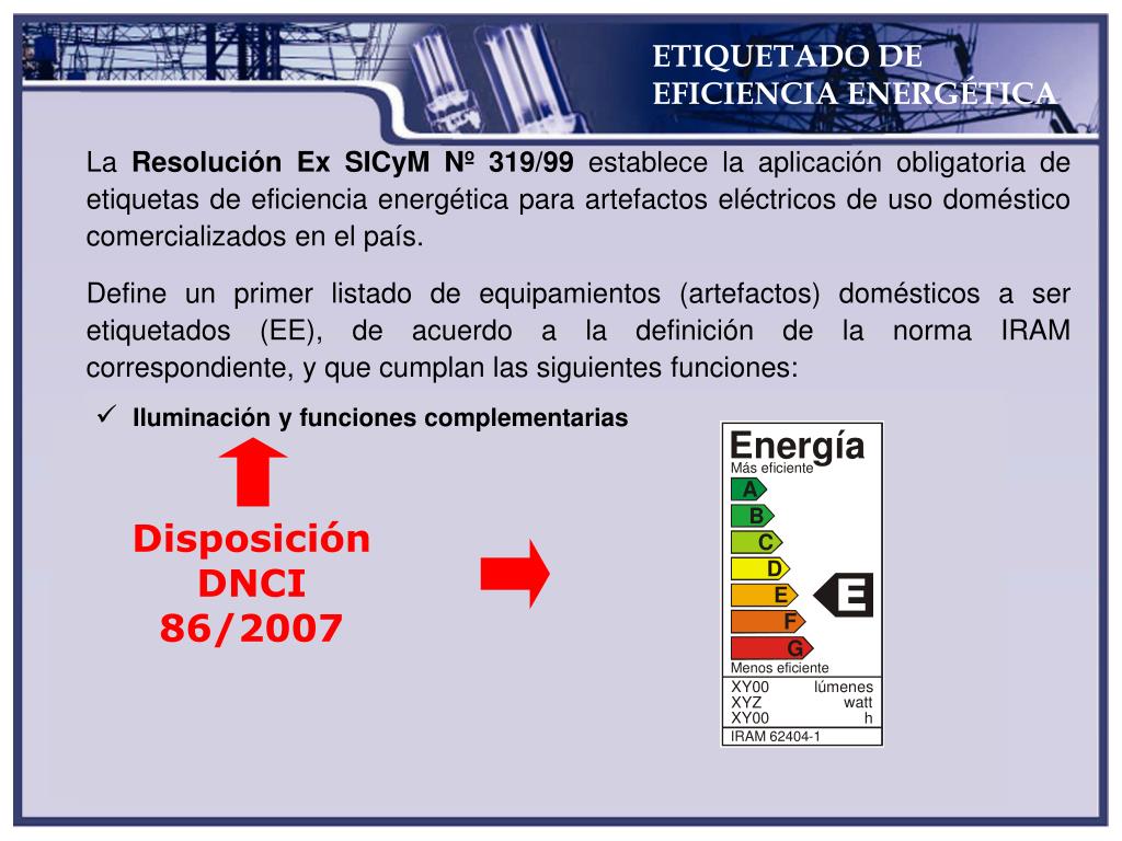ETIQUETADO DE EFICIENCIA ENERGÉTICA La Resolución ExSICyM Nº 319/99 establece la aplicación obligatoria de etiquetas de eficiencia energética para artefactos eléctricos de uso doméstico comercializados en el país. Define un primer listado de equipamientos (artefactos) domésticos a ser etiquetados (EE), de acuerdo a la definición de la norma IRAM correspondiente, y que cumplan las siguientes funciones: • Refrigeración, congelación de alimentos y sus combinaciones • Iluminación y funciones complementarias • Iluminación y funciones complementarias • Fuerza Motriz de accionamiento eléctrico Resolución SCT 35/2005 Disposición DNCI 86/2007 • Acondicionamiento de aire • Lavado, secado de ropas y funciones combinadas • Calentar agua para baños y cocinas por medio de la electricidad • Lavado de vajillas • Hornear alimentos