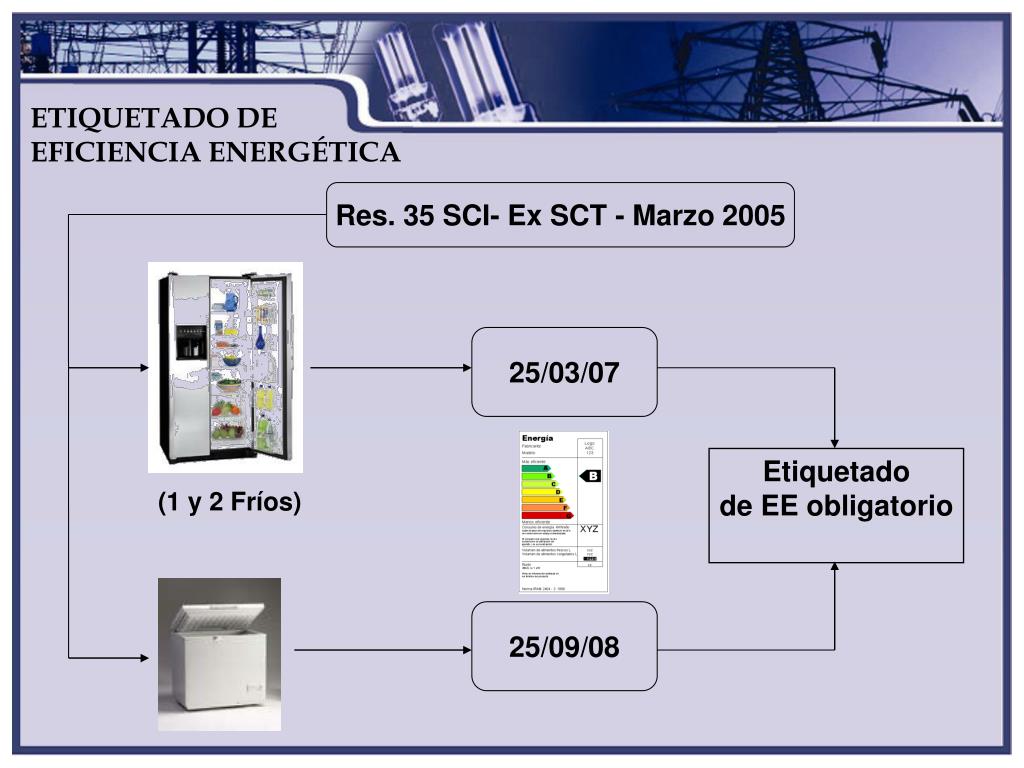 ETIQUETADO DE EFICIENCIA ENERGÉTICA Res. 35 SCI- Ex SCT - Marzo 2005 25/03/07 Etiquetado de EE obligatorio (1 y 2 Fríos) 25/09/08