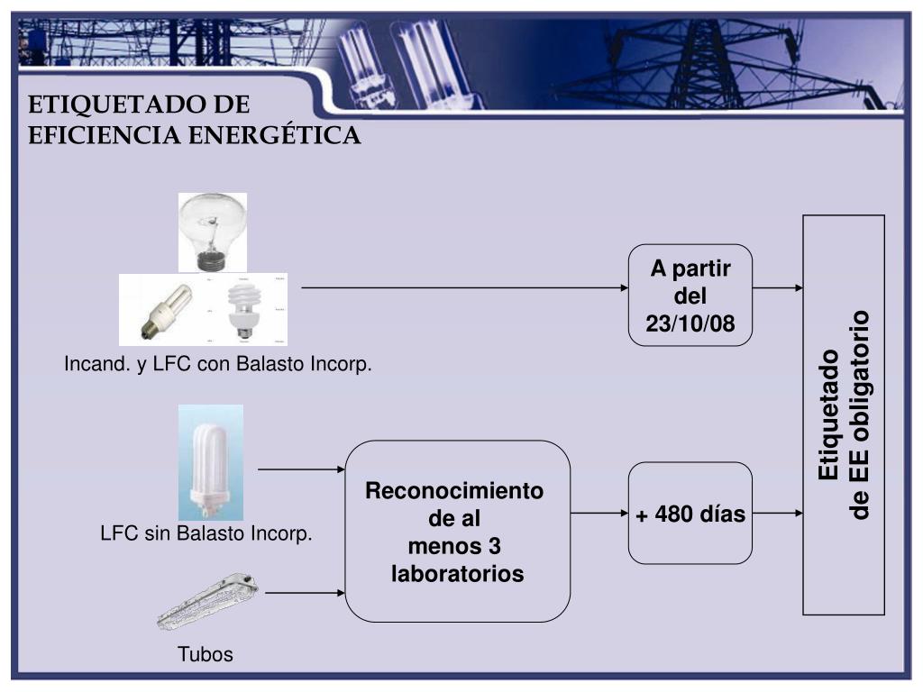ETIQUETADO DE EFICIENCIA ENERGÉTICA Etiquetado de EE obligatorio A partir del 23/10/08 Incand. y LFC con Balasto Incorp. Reconocimiento de al menos 3 laboratorios + 480 días LFC sin Balasto Incorp. Tubos