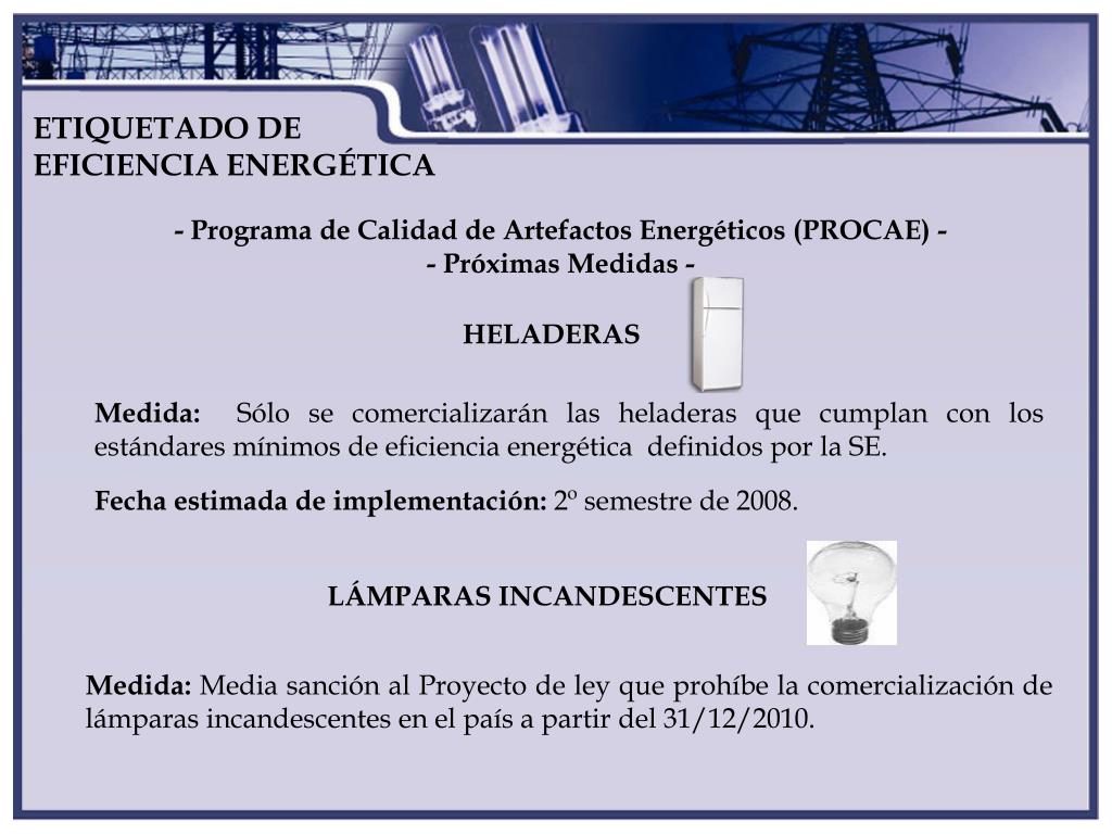 ETIQUETADO DE EFICIENCIA ENERGÉTICA - Programa de Calidad de Artefactos Energéticos (PROCAE) - - Próximas Medidas - HELADERAS Medida: Sólo se comercializarán las heladeras que cumplan con los estándares mínimos de eficiencia energética definidos por la SE. Fecha estimada de implementación: 2º semestre de 2008. LÁMPARAS INCANDESCENTES Medida: Media sanción al Proyecto de ley que prohíbe la comercialización de lámparas incandescentes en el país a partir del 31/12/2010.