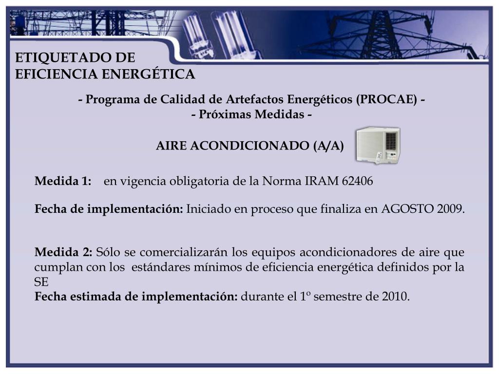 ETIQUETADO DE EFICIENCIA ENERGÉTICA - Programa de Calidad de Artefactos Energéticos (PROCAE) - - Próximas Medidas - AIRE ACONDICIONADO (A/A) Medida 1: en vigencia obligatoria de la Norma IRAM 62406 Fecha de implementación: Iniciado en proceso que finaliza en AGOSTO 2009. Medida 2: Sólo se comercializarán los equipos acondicionadores de aire que cumplan con los estándares mínimos de eficiencia energética definidos por la SE Fecha estimada de implementación: durante el 1º semestre de 2010.