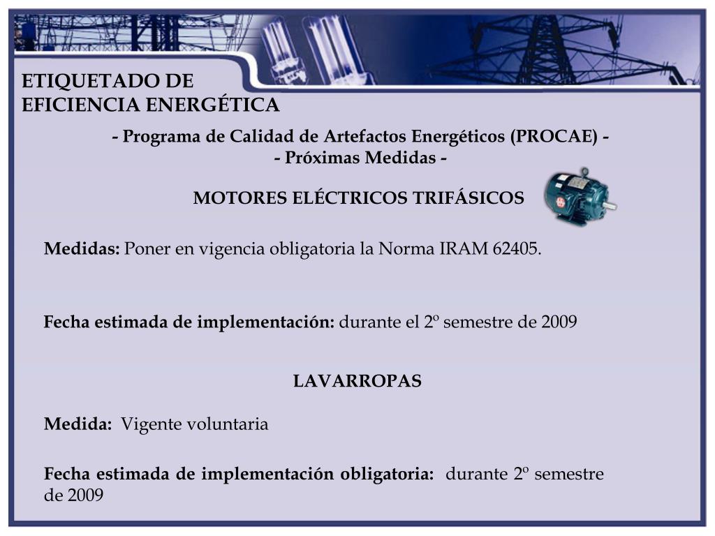 ETIQUETADO DE EFICIENCIA ENERGÉTICA - Programa de Calidad de Artefactos Energéticos (PROCAE) - - Próximas Medidas - MOTORES ELÉCTRICOS TRIFÁSICOS Medidas: Poner en vigencia obligatoria la Norma IRAM 62405. Fecha estimada de implementación: durante el 2º semestre de 2009 LAVARROPAS Medida: Vigente voluntaria Fecha estimada de implementación obligatoria: durante2º semestre de 2009