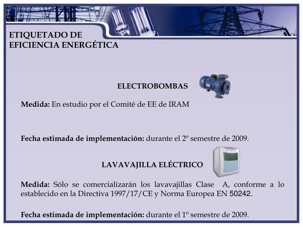 ETIQUETADO DE EFICIENCIA ENERGÉTICA ELECTROBOMBAS Medida: En estudiopor el Comité de EE de IRAM Fecha estimada de implementación: durante el 2º semestre de 2009. LAVAVAJILLA ELÉCTRICO Medida: Sólo se comercializarán los lavavajillas Clase A, conforme a lo establecido en la Directiva 1997/17/CE y Norma Europea EN 50242. Fecha estimada de implementación: durante el 1º semestre de 2009.