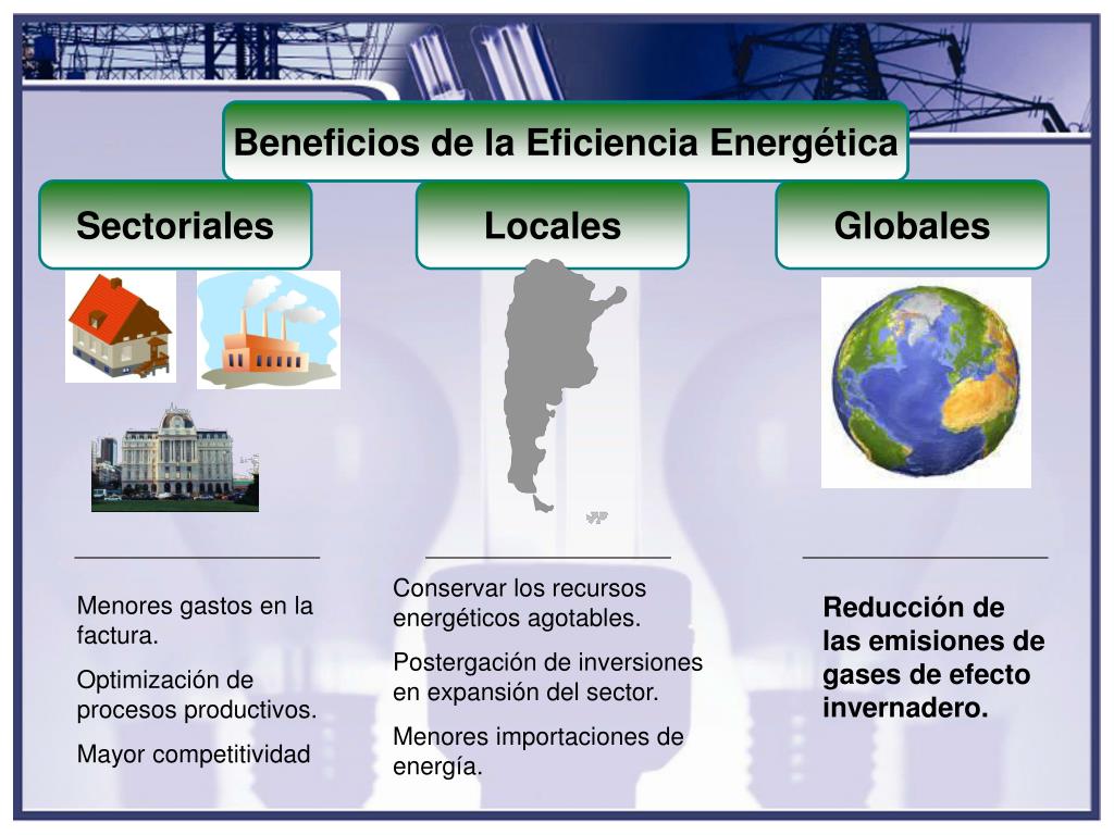 Beneficios de la Eficiencia Energética Sectoriales Locales Globales Conservar los recursos energéticos agotables. Postergación de inversiones en expansión del sector. Menores importaciones de energía. Menores gastos en la factura. Optimización de procesos productivos. Mayor competitividad Reducción de las emisiones de gases de efecto invernadero.