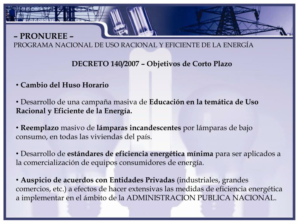 – PRONUREE – PROGRAMA NACIONAL DE USO RACIONAL Y EFICIENTE DE LA ENERGÍA DECRETO 140/2007 – Objetivos de Corto Plazo • Cambio del Huso Horario • Desarrollo de una campaña masiva de Educación en la temática de Uso Racional y Eficiente de la Energía. • Reemplazo masivo de lámparas incandescentes por lámparas de bajo consumo, en todas las viviendas del país. • Desarrollo de estándares de eficiencia energética mínima para ser aplicados a la comercialización de equipos consumidores de energía. • Auspicio de acuerdos con Entidades Privadas (industriales, grandes comercios, etc.) a efectos de hacer extensivas las medidas de eficiencia energética a implementar en el ámbito de la ADMINISTRACION PUBLICA NACIONAL.