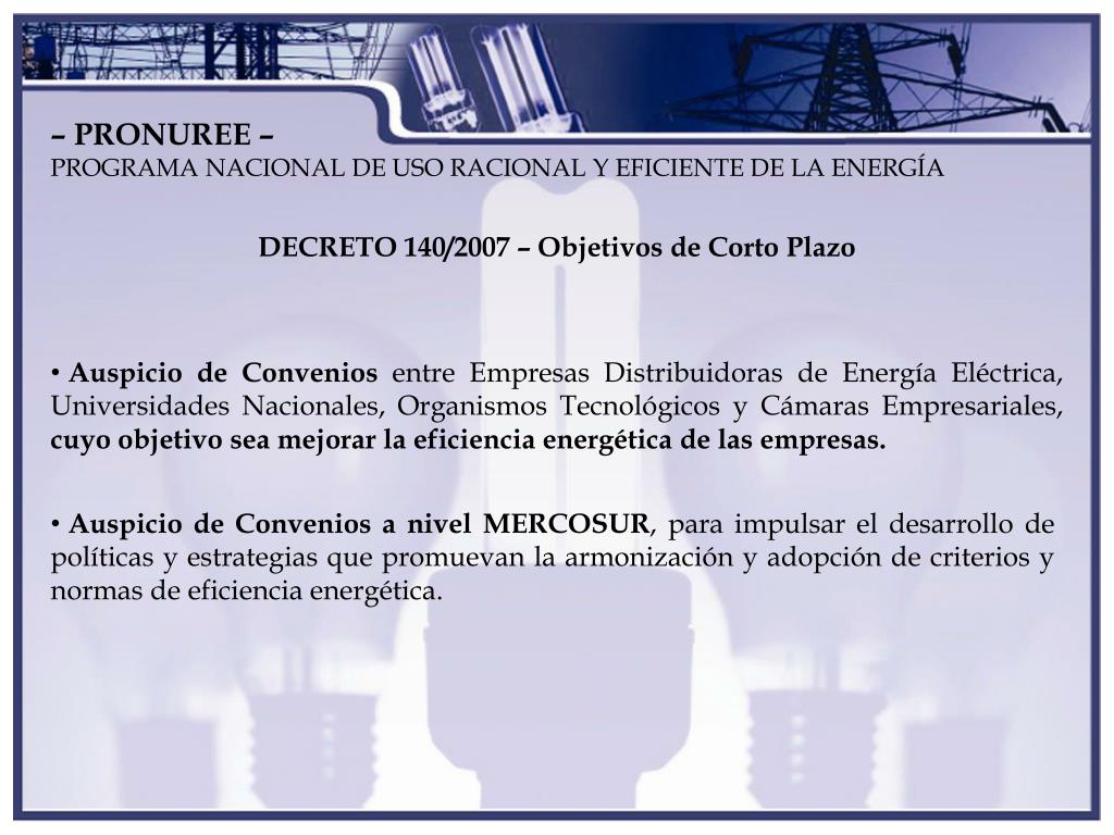 – PRONUREE – PROGRAMA NACIONAL DE USO RACIONAL Y EFICIENTE DE LA ENERGÍA DECRETO 140/2007 – Objetivos de Corto Plazo • Auspicio de Convenios entre Empresas Distribuidoras de Energía Eléctrica, Universidades Nacionales, Organismos Tecnológicos y Cámaras Empresariales, cuyo objetivo sea mejorar la eficiencia energética de las empresas. • Auspicio de Convenios a nivel MERCOSUR, para impulsar el desarrollo de políticas y estrategias que promuevan la armonización y adopción de criterios y normas de eficiencia energética.