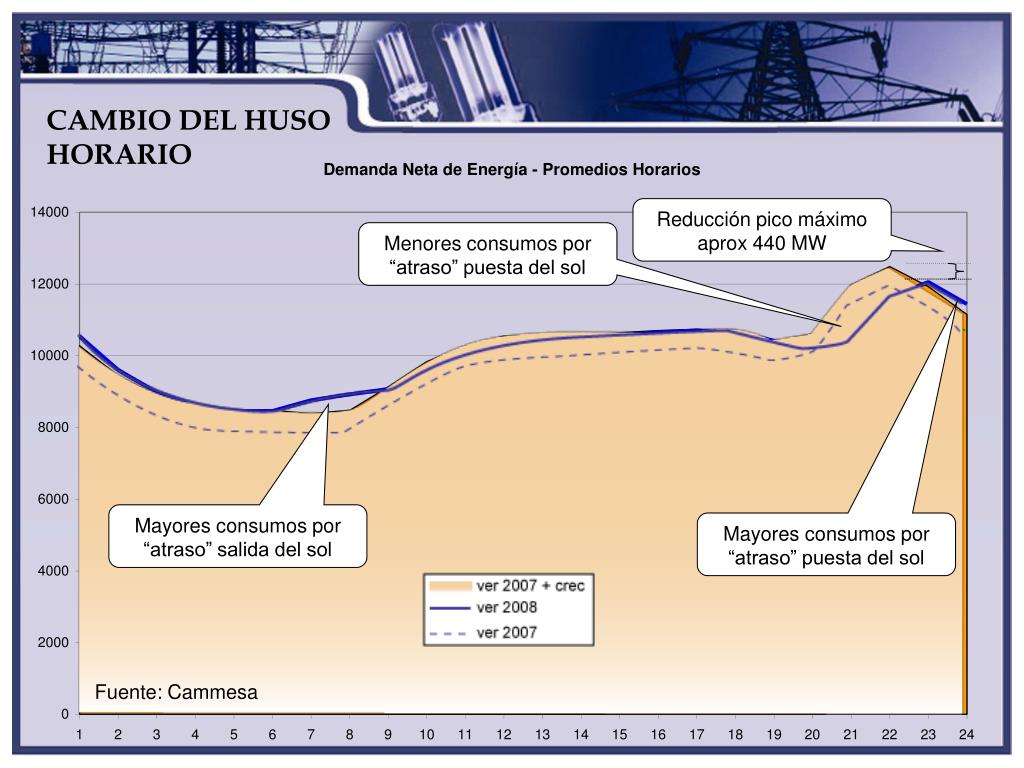 CAMBIO DEL HUSOHORARIO Reducción pico máximo aprox 440 MW Menores consumos por “atraso” puesta del sol Mayores consumos por “atraso” salida del sol Mayores consumos por “atraso” puesta del sol Fuente: Cammesa