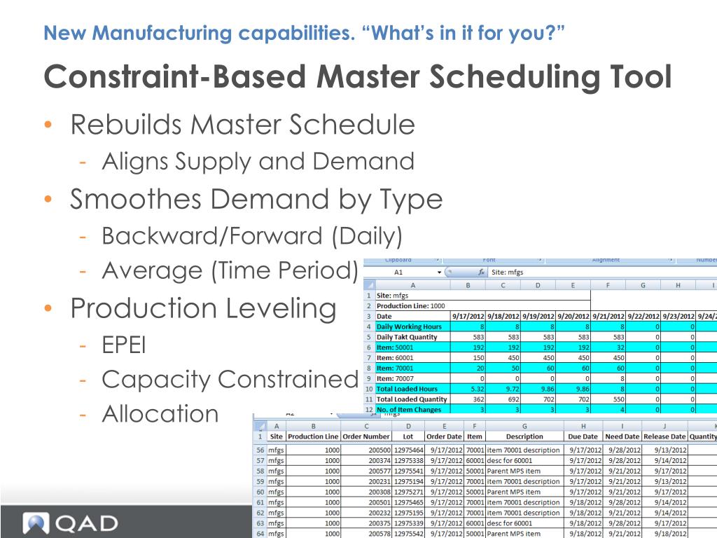 New Manufacturing capabilities. “What’s in it for you?” Constraint-Based Master Scheduling Tool • Rebuilds Master Schedule • Aligns Supply and Demand • Smoothes Demand by Type • Backward/Forward (Daily) • Average (Time Period) • Production Leveling • EPEI • Capacity Constrained • Allocation