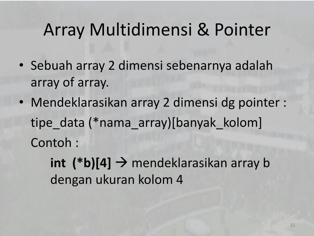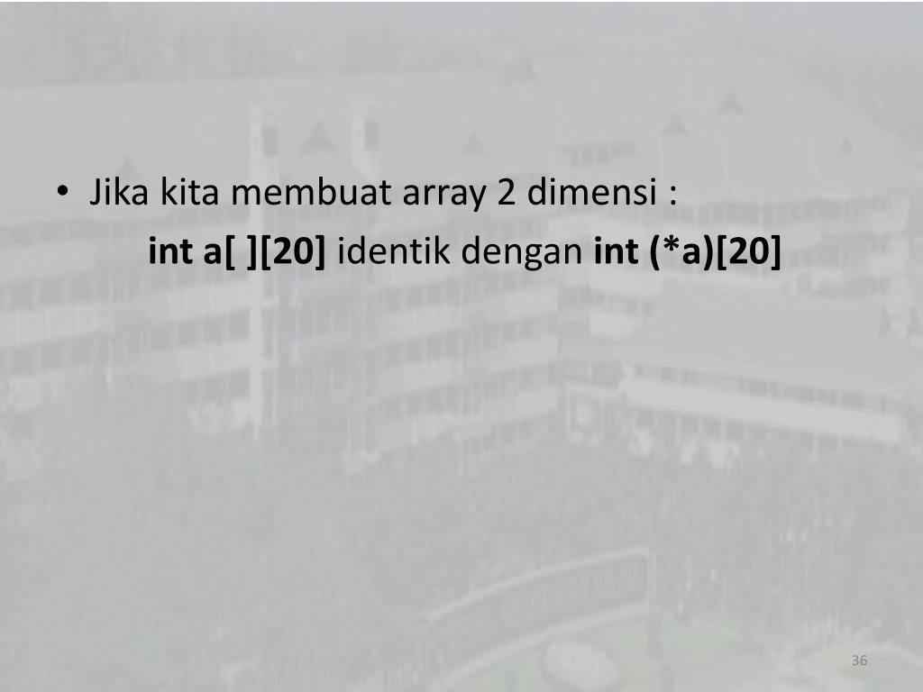 Jika kita membuat array 2 dimensi : int a[ ][20] identik dengan int (*a)[20]