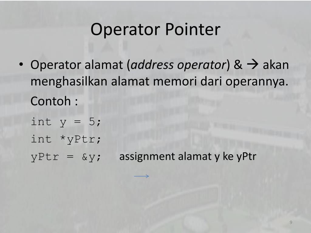 Operasi pada Pointer • Variabel pointer dapat dioperasikan sebagaimana variabel biasa, antara lain : • Operasi assignment • Operasi aritmatika • Operasi logika