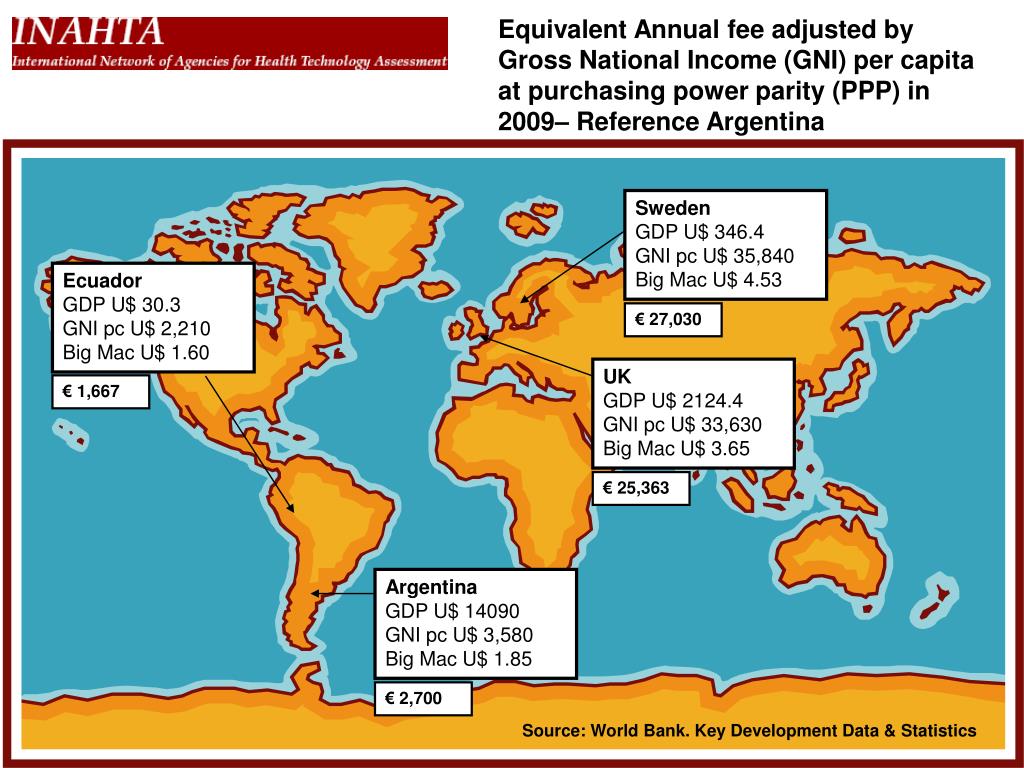 Equivalent Annual fee adjusted by Gross National Income (GNI) per capita at purchasing power parity (PPP) in 2009– Reference Argentina Sweden GDP U$ 346.4 GNI pc U$ 35,840 Big Mac U$ 4.53 Ecuador GDP U$ 30.3 GNI pc U$ 2,210 Big Mac U$ 1.60 € 27,030 UK GDP U$ 2124.4 GNI pc U$ 33,630 Big Mac U$ 3.65 € 1,667 € 25,363 Argentina GDP U$ 14090 GNI pc U$ 3,580 Big Mac U$ 1.85 € 2,700 Source: World Bank. Key Development Data & Statistics