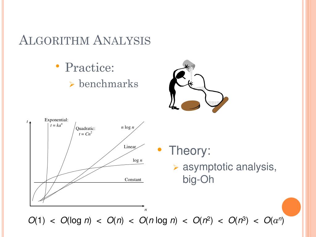 Algorithm Analysis • Practice: • benchmarks • Theory: • asymptotic analysis, big-Oh O(1) < O(logn) < O(n) < O(nlog n) < O(n2) < O(n3) < O(an)