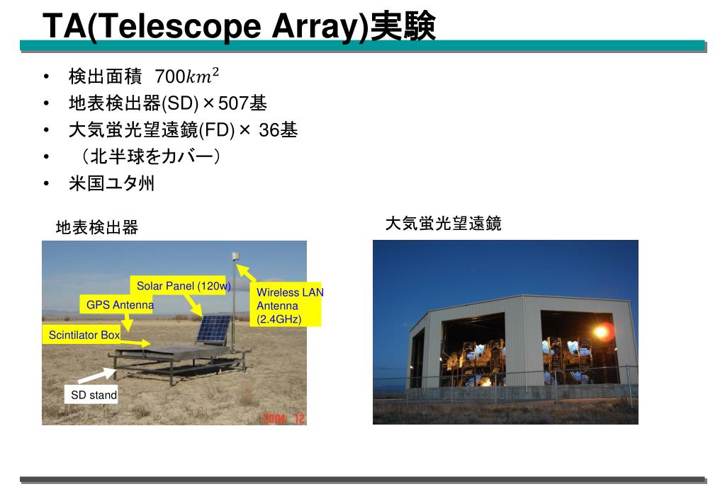 Solar Panel (120w) Wireless LAN Antenna (2.4GHz) GPS Antenna Scintilator Box SD stand TA(Telescope Array)実験 • 検出面積 700 • 地表検出器(SD)×507基 • 大気蛍光望遠鏡(FD)× 36基 • (北半球をカバー) • 米国ユタ州 大気蛍光望遠鏡 地表検出器