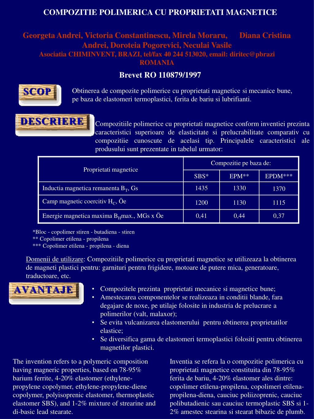 COMPOZITIE POLIMERICA CU PROPRIETATI MAGNETICE Georgeta Andrei, Victoria Constantinescu, Mirela Moraru, Diana Cristina Andrei, Doroteia Pogorevici, Neculai Vasile Asociatia CHIMINVENT, BRAZI, tel/fax 40 244 513020, email: diritec@pbrazi ROMANIA Brevet RO 110879/1997 Obtinerea de compozite polimerice cu proprietati magnetice si mecanice bune, pe baza de elastomeri termoplastici, ferita de bariu si lubrifianti. Compozitiile polimerice cu proprietati magnetice conform inventiei prezinta caracteristici superioare de elasticitate si prelucrabilitate comparativ cu compozitiie cunoscute de acelasi tip. Principalele caracteristici ale produsului sunt prezentate in tabelul urmator: *Bloc - copolimer stiren - butadiena - stiren ** Copolimer etilena - propilena *** Copolimer etilena - propilena - diena Domenii de utilizare: Compozitiile polimerice cu proprietati magnetice se utilizeaza la obtinerea de magneti plastici pentru: garnituri pentru frigidere, motoare de putere mica, generatoare, traductoare, etc. • Compozitele prezinta proprietati mecanice si magnetice bune; • Amestecarea componentelor se realizeaza in conditii blande, fara degajare de noxe, pe utilaje folosite in industria de prelucrare a polimerilor (valt, malaxor); • Se evita vulcanizarea elastomerului pentru obtinerea proprietatilor elastice; • Se diversifica gama de elastomeri termoplastici folositi pentru obtinerea magnetilor plastici. The invention refers to a polymeric composition having magneric properties, based on 78-95% barium ferrite, 4-20% elastomer (ethylene-propylene copolymer, ethylene-propylene-diene copolymer, polyisoprenic elastomer, thermoplastic elastomer SBS), and 1-2% mixture of strearine and di-basic lead stearate. Inventia se refera la o compozitie polimerica cu proprietati magnetice constituita din 78-95% ferita de bariu, 4-20% elastomer ales dintre: copolimer etilena-propilena, copolimeri etilena-propilena-diena, cauciuc poliizoprenic, cauciuc polibutadienic sau cauciuc termoplastic SBS si 1-2% amestec stearina si stearat bibazic de plumb.