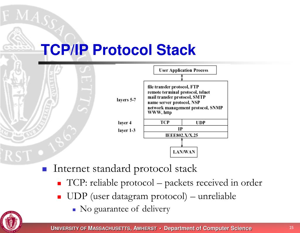 TCP/IP Protocol Stack • Internet standard protocol stack • TCP: reliable protocol – packets received in order • UDP (user datagram protocol) – unreliable • No guarantee of delivery