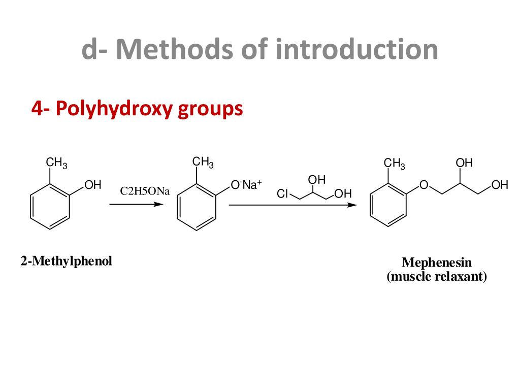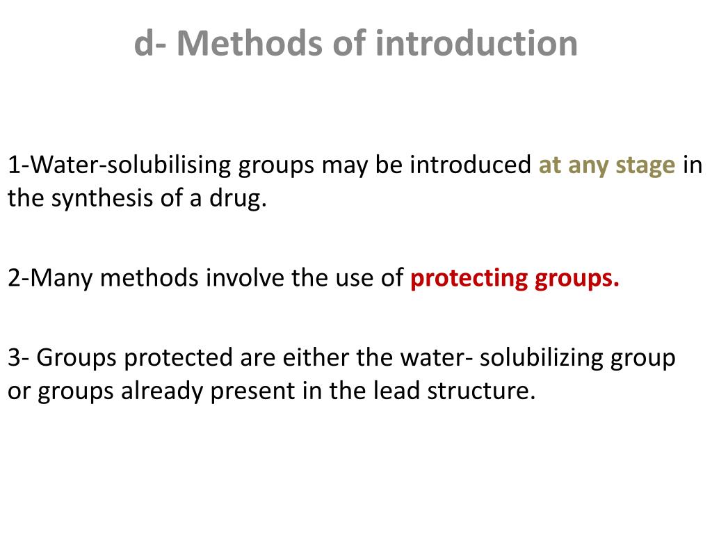 d- Methods of introduction 1-Water-solubilising groups may be introduced at any stage in the synthesis of a drug. 2-Many methods involve the use of protecting groups. 3- Groups protected are either the water- solubilizing group or groups already present in the lead structure.