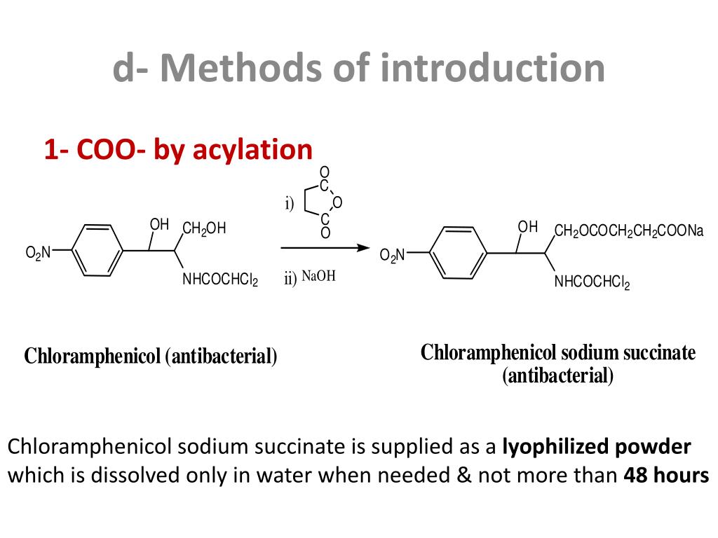 d- Methods of introduction 1- COO- by acylation Chloramphenicol sodium succinate is supplied as a lyophilized powder which is dissolved only in water when needed & not more than 48 hours