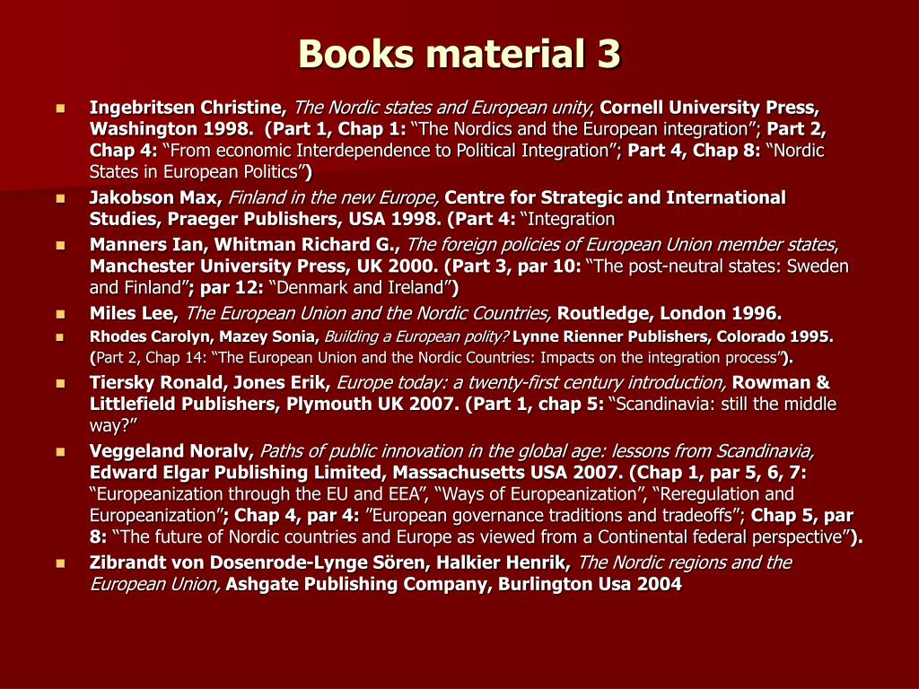 Books material 3 • Ingebritsen Christine, The Nordic states and European unity, Cornell University Press, Washington 1998. (Part 1, Chap 1: “The Nordics and the European integration”; Part 2, Chap 4: “From economic Interdependence to Political Integration”; Part 4, Chap 8: “Nordic States in European Politics”) • Jakobson Max, Finland in the new Europe, Centre for Strategic and International Studies, Praeger Publishers, USA 1998. (Part 4: “Integration • Manners Ian, Whitman Richard G., The foreign policies of European Union member states, Manchester University Press, UK 2000. (Part 3, par 10: “The post-neutral states: Sweden and Finland”; par 12: “Denmark and Ireland”) • Miles Lee, The European Union and the Nordic Countries, Routledge, London 1996. • Rhodes Carolyn, Mazey Sonia, Building a European polity?Lynne Rienner Publishers, Colorado 1995. (Part 2, Chap 14: “The European Union and the Nordic Countries: Impacts on the integration process”). • Tiersky Ronald, Jones Erik, Europe today: a twenty-first century introduction, Rowman & Littlefield Publishers, Plymouth UK 2007. (Part 1, chap 5: “Scandinavia: still the middle way?” • Veggeland Noralv, Paths of public innovation in the global age: lessons from Scandinavia, Edward Elgar Publishing Limited, Massachusetts USA 2007. (Chap 1, par 5, 6, 7: “Europeanization through the EU and EEA”, “Ways of Europeanization”, “Reregulation and Europeanization”; Chap 4, par 4: ”European governance traditions and tradeoffs”; Chap 5, par 8: “The future of Nordic countries and Europe as viewed from a Continental federal perspective”). • Zibrandt von Dosenrode-Lynge Sören, Halkier Henrik, The Nordic regions and the European Union, Ashgate Publishing Company, Burlington Usa 2004