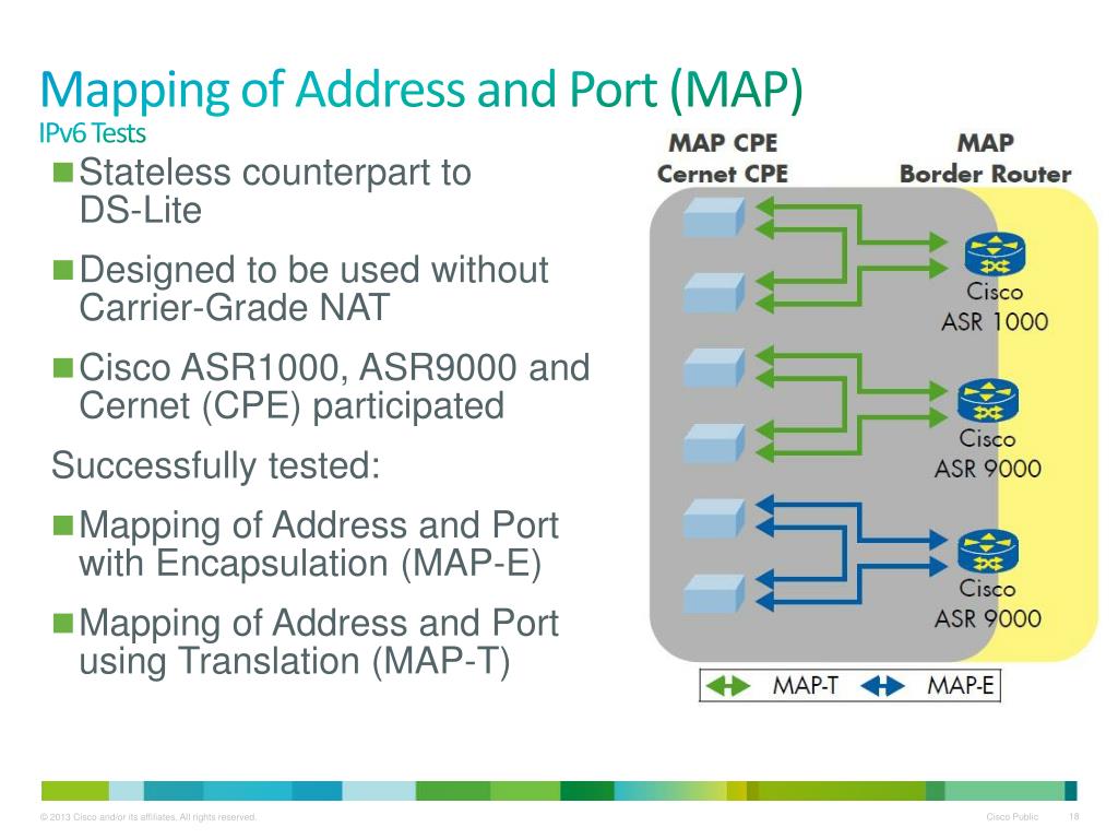 Mapping of Address and Port (MAP)IPv6 Tests • Stateless counterpart to DS-Lite • Designed to be used without Carrier-Grade NAT • Cisco ASR1000, ASR9000 and Cernet (CPE) participated Successfully tested: • Mapping of Address and Port with Encapsulation (MAP-E) • Mapping of Address and Port using Translation (MAP-T)