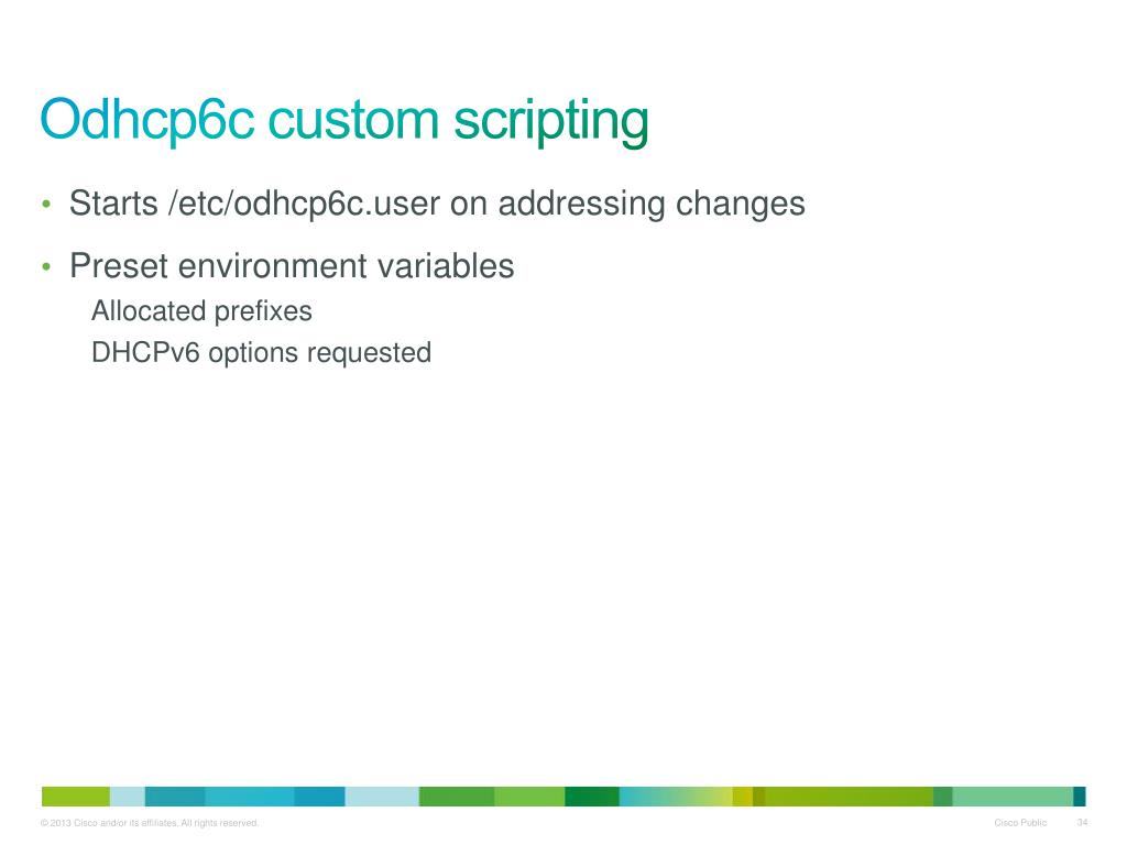 Odhcp6c custom scripting • Starts /etc/odhcp6c.user on addressing changes • Preset environment variables • Allocated prefixes • DHCPv6 options requested