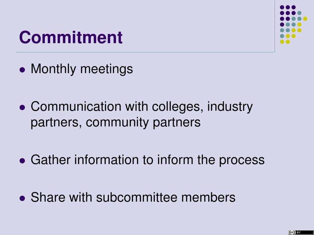 Commitment • Monthly meetings • Communication with colleges, industry partners, community partners • Gather information to inform the process • Share with subcommittee members