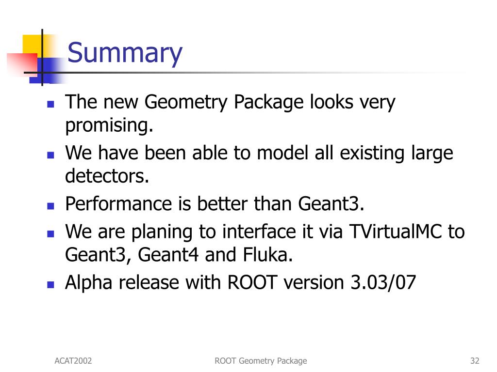 Summary • The new Geometry Package looks very promising. • We have been able to model all existing large detectors. • Performance is better than Geant3. • We are planing to interface it via TVirtualMC to Geant3, Geant4 and Fluka. • Alpha release with ROOT version 3.03/07 ROOT Geometry Package
