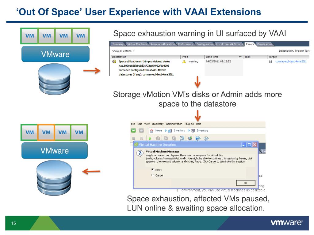 ‘Out Of Space’ User Experience with VAAI Extensions Space exhaustion warning in UI surfaced by VAAI VMware Storage vMotion VM’s disks or Admin adds more space to the datastore VMware Space exhaustion, affected VMs paused, LUN online & awaiting space allocation.