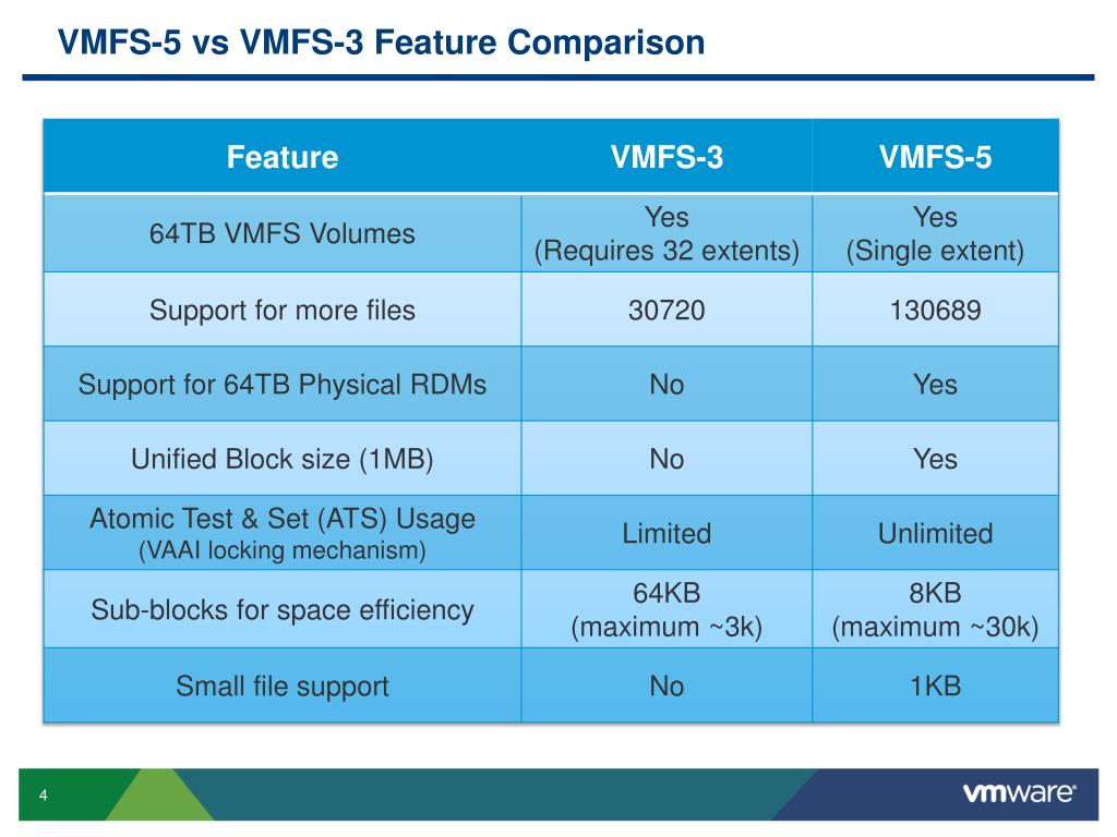 VMFS-5 New Volume Creation (2 of 2) • Newly created VMFS-5 filesystems now use the GPT (GUID Partition Table)partition format. • GPT is needed to enable the creation of volumes larger than 2TB. • Previous versions use the MBR (Master Boot Record) partition format.