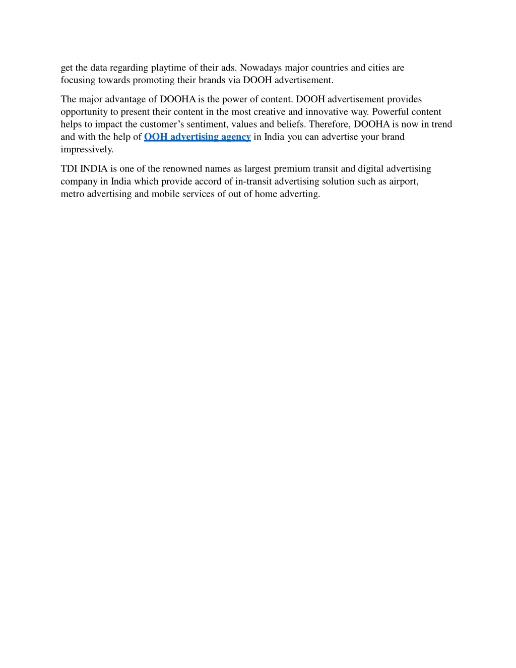 get thedata regardingplaytimeof theirads.Nowadays major countriesandcitiesarefocusing towards promotingtheirbrands viaDOOH advertisement. Themajor advantageofDOOHA is thepower of content.DOOHadvertisement provides opportunityto present their content in themost creative and innovativeway.Powerful content helps to impact the customer’s sentiment, values and beliefs. Therefore, DOOHAis now in trend and with thehelp ofOOH advertising agencyinIndiayou canadvertiseyour brand impressively. TDIINDIA is oneof the renownednames as largest premium transit and digital advertising companyinIndia whichprovideaccord of in-transit advertisingsolution such as airport, metro advertising and mobile services of out of home adverting.