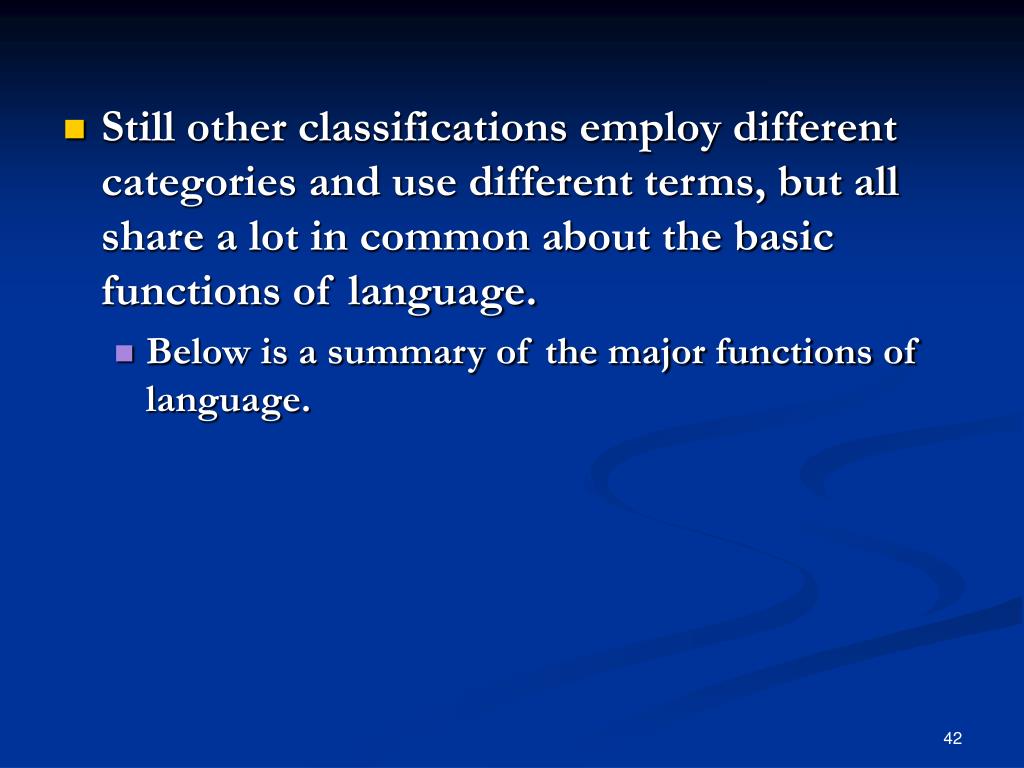 Still other classifications employ different categories and use different terms, but all share a lot in common about the basic functions of language. • Below is a summary of the major functions of language.