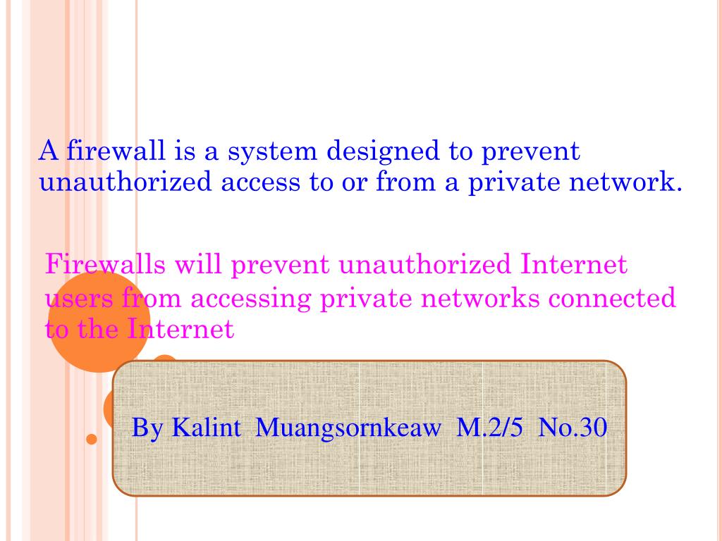 A firewall is a system designed to prevent unauthorized access to or from a private network. Firewalls will prevent unauthorized Internet users from accessing private networks connected to the Internet By KalintMuangsornkeaw M.2/5 No.30