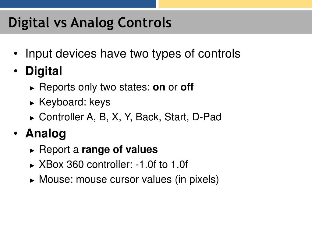 Digital vs Analog Controls • Input devices have two types of controls • Digital • Reports only two states: on or off • Keyboard: keys • Controller A, B, X, Y, Back, Start, D-Pad • Analog • Report a range of values • XBox 360 controller: -1.0f to 1.0f • Mouse: mouse cursor values (in pixels)
