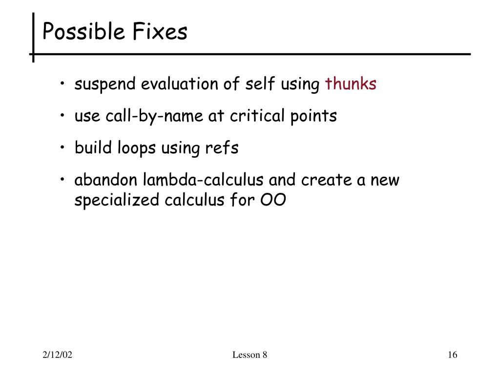 Possible Fixes • suspend evaluation of self using thunks • use call-by-name at critical points • build loops using refs • abandon lambda-calculus and create a new specialized calculus for OO Lesson 8