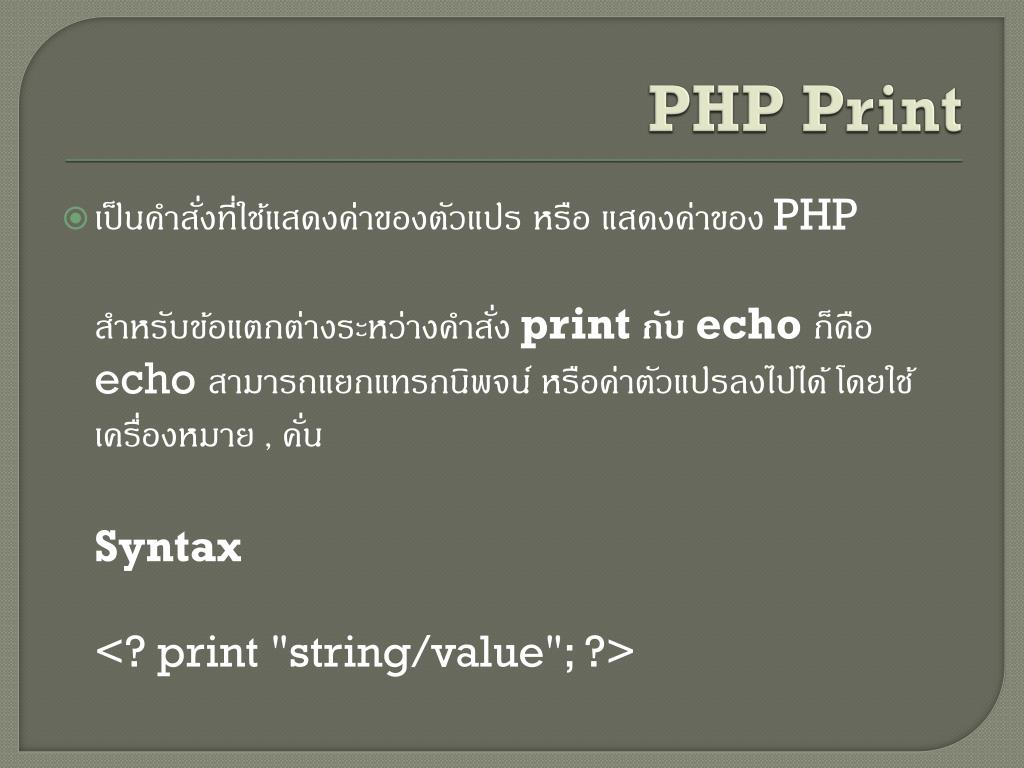PHP Print เป็นคำสั่งที่ใช้แสดงค่าของตัวแปร หรือ แสดงค่าของ PHP สำหรับข้อแตกต่างระหว่างคำสั่ง print กับ echoก็คือ echo สามารถแยกแทรกนิพจน์ หรือค่าตัวแปรลงไปได้ โดยใช้เครื่องหมาย , คั่นSyntax<? print "string/value"; ?>