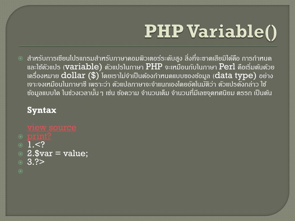 PHP Variable() สำหรับการเขียนโปรแกรมสำหรับภาษาคอมพิวเตอร์ระดับสูง สิ่งที่จะขาดเสียมิได้คือ การกำหนดและใช้ตัวแปร (variable) ตัวแปรในภาษา PHP จะเหมือนกับในภาษา Perl คือเริ่มต้นด้วยเครื่องหมาย dollar ($) โดยเราไม่จำเป็นต้องกำหนดแบบของข้อมูล (data type) อย่างเจาะจงเหมือนในภาษาซี เพราะว่า ตัวแปลภาษาจะจำแนกเองโดยอัตโนมัติว่า ตัวแปรดังกล่าว ใช้ข้อมูลแบบใด ในช่วงเวลานั้นๆ เช่น ข้อความ จำนวนเต็ม จำนวนที่มีเลขจุดทศนิยม ตรรก เป็นต้นSyntaxview source print? 1.<? 2.$var = value; 3.?>