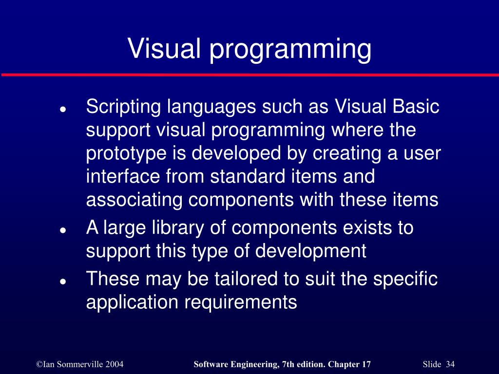 Visual programming • Scripting languages such as Visual Basic support visual programming where the prototype is developed by creating a user interface from standard items and associating components with these items • A large library of components exists to support this type of development • These may be tailored to suit the specific application requirements