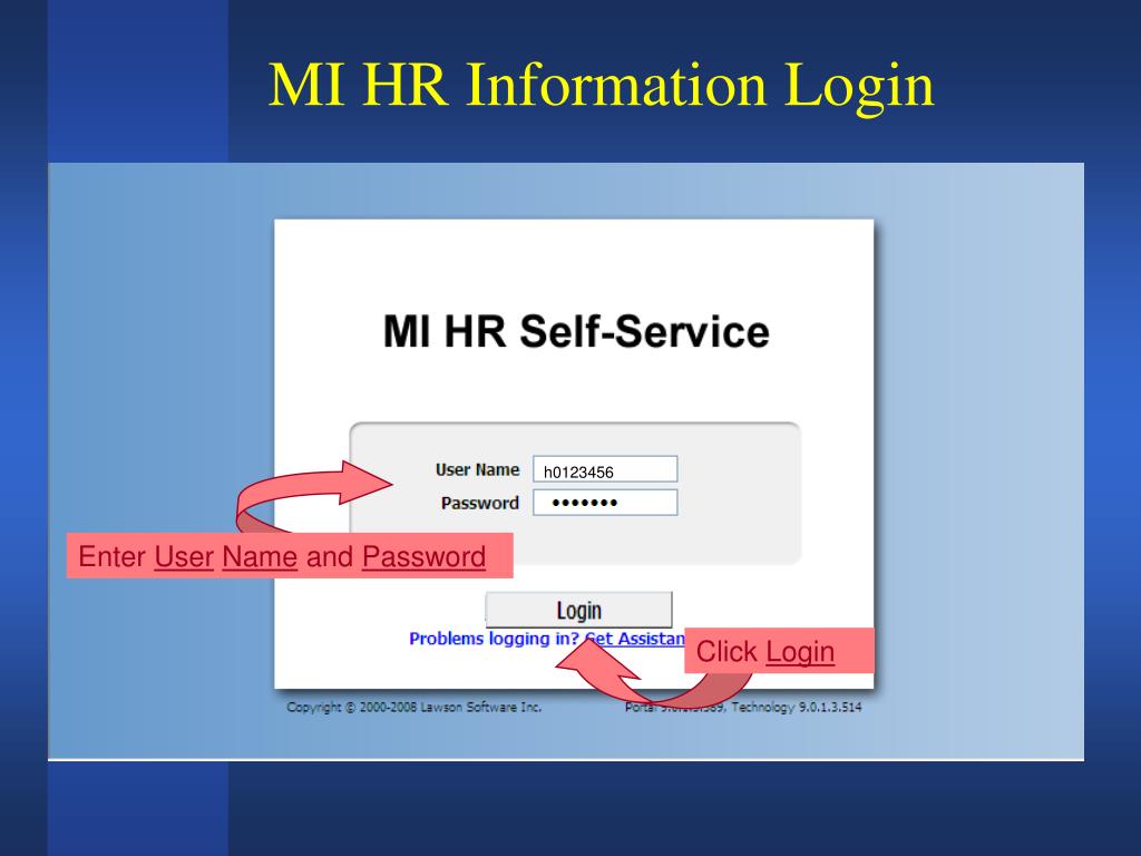 MI HR Information Login h0123456 Enter UserName and Password Click Login