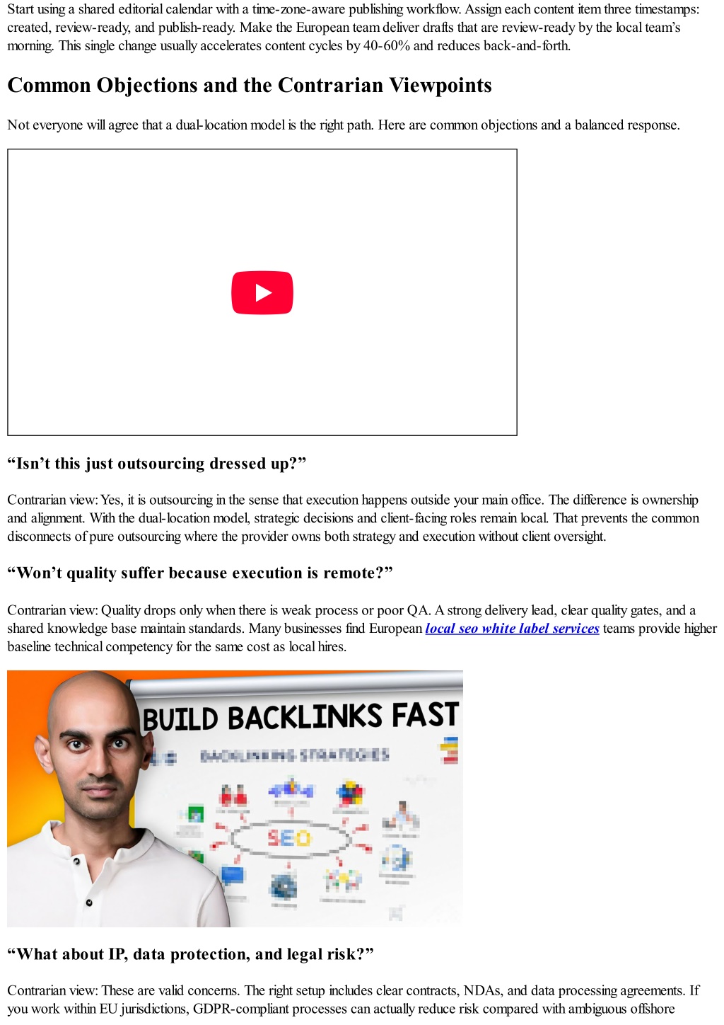 Start using a shared editorial calendar with a time-zone-aware publishing workflow. Assign each content item three timestamps: created, review-ready, and publish-ready. Make the European team deliver drafts that are review-ready by the local team’s morning. This single change usually accelerates content cycles by 40-60% and reduces back-and-forth. Common Objections and the Contrarian Viewpoints Not everyone will agree that a dual-location model is the right path. Here are common objections and a balanced response. “Isn’t this just outsourcing dressed up?” Contrarian view: Yes, it is outsourcing in the sense that execution happens outside your main office. The difference is ownership and alignment. With the dual-location model, strategic decisions and client-facing roles remain local. That prevents the common disconnects of pure outsourcing where the provider owns both strategy and execution without client oversight. “Won’t quality suffer because execution is remote?” Contrarian view: Quality drops only when there is weak process or poor QA. A strong delivery lead, clear quality gates, and a shared knowledge base maintain standards. Many businesses find European local seo white label services teams provide higher baseline technical competency for the same cost as local hires. “What about IP, data protection, and legal risk?” Contrarian view: These are valid concerns. The right setup includes clear contracts, NDAs, and data processing agreements. If you work within EU jurisdictions, GDPR-compliant processes can actually reduce risk compared with ambiguous offshore