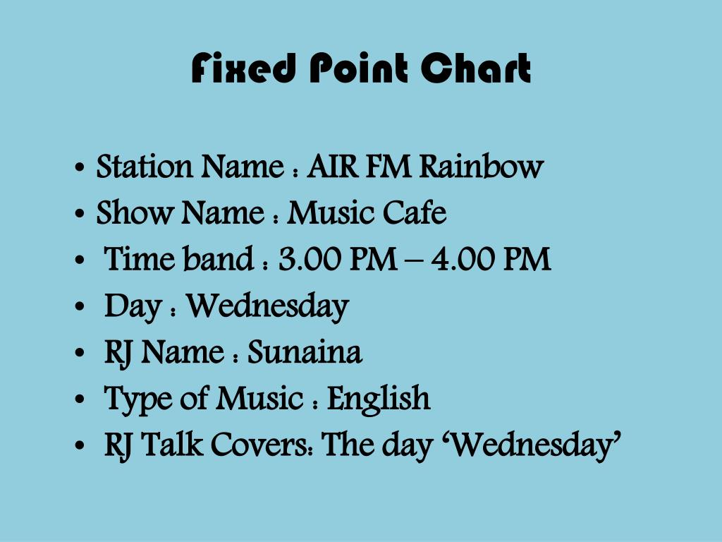 Fixed Point Chart • Station Name : AIR FM Rainbow • Show Name : Music Cafe • Time band : 3.00 PM – 4.00 PM • Day : Wednesday • RJ Name : Sunaina • Type of Music : English • RJ Talk Covers: The day ‘Wednesday’