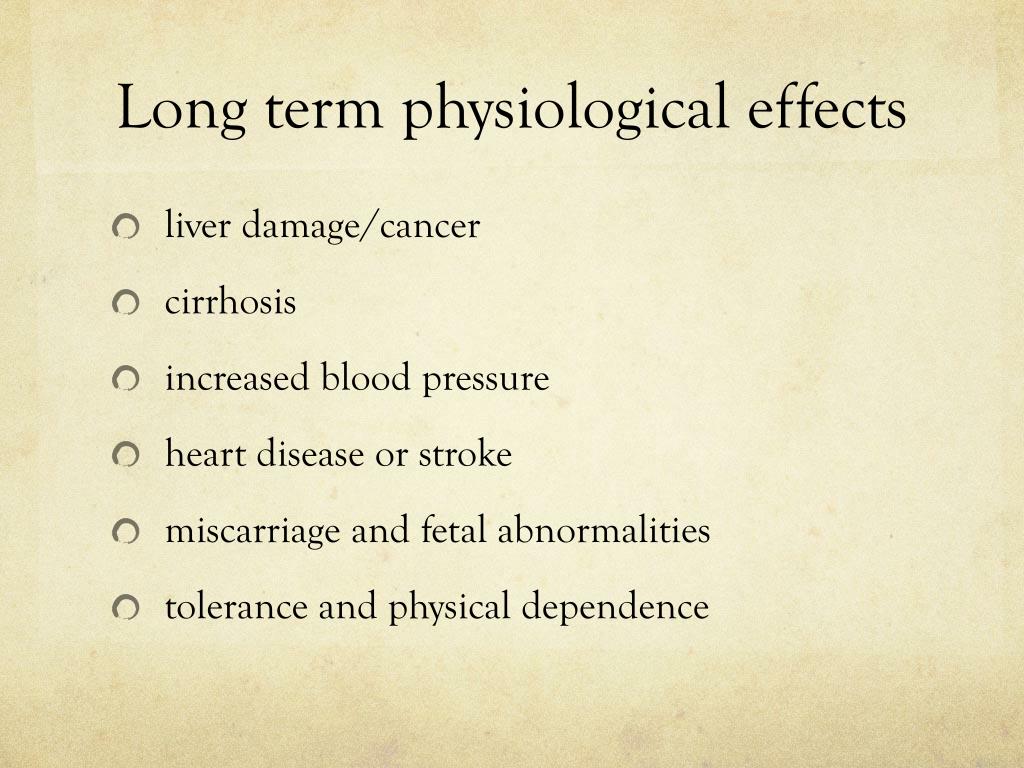 Long term physiological effects • liver damage/cancer • cirrhosis • increased blood pressure • heart disease or stroke • miscarriage and fetal abnormalities • tolerance and physical dependence