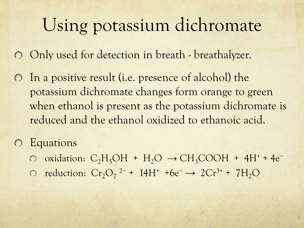 Using potassium dichromate • Only used for detection in breath - breathalyzer. • In a positive result (i.e. presence of alcohol) the potassium dichromate changes form orange to green when ethanol is present as the potassium dichromate is reduced and the ethanol oxidized to ethanoic acid. • Equations • oxidation: C2H5OH + H2O → CH3COOH + 4H+ + 4e− • reduction: Cr2O72−+ 14H+ +6e−→ 2Cr3++ 7H2O