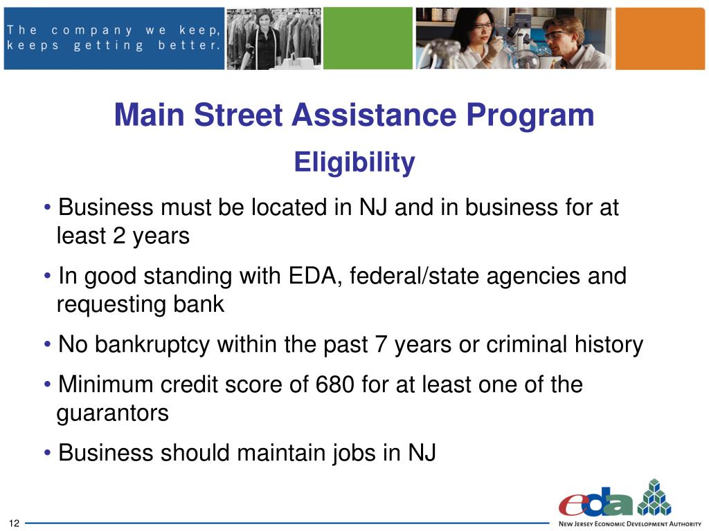 Main Street Assistance Program Eligibility • Business must be located in NJ and in business for at • least 2 years • In good standing with EDA, federal/state agencies and • requesting bank • No bankruptcy within the past 7 years or criminal history • Minimum credit score of 680 for at least one of the • guarantors • Business should maintain jobs in NJ