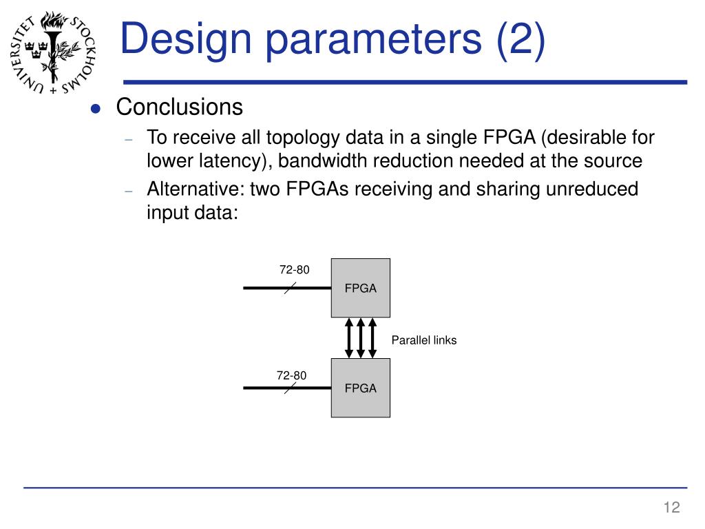 Design parameters (2) • Conclusions • To receive all topology data in a single FPGA (desirable for lower latency), bandwidth reduction needed at the source • Alternative: two FPGAs receiving and sharing unreduced input data: 72-80 FPGA Parallel links FPGA 72-80
