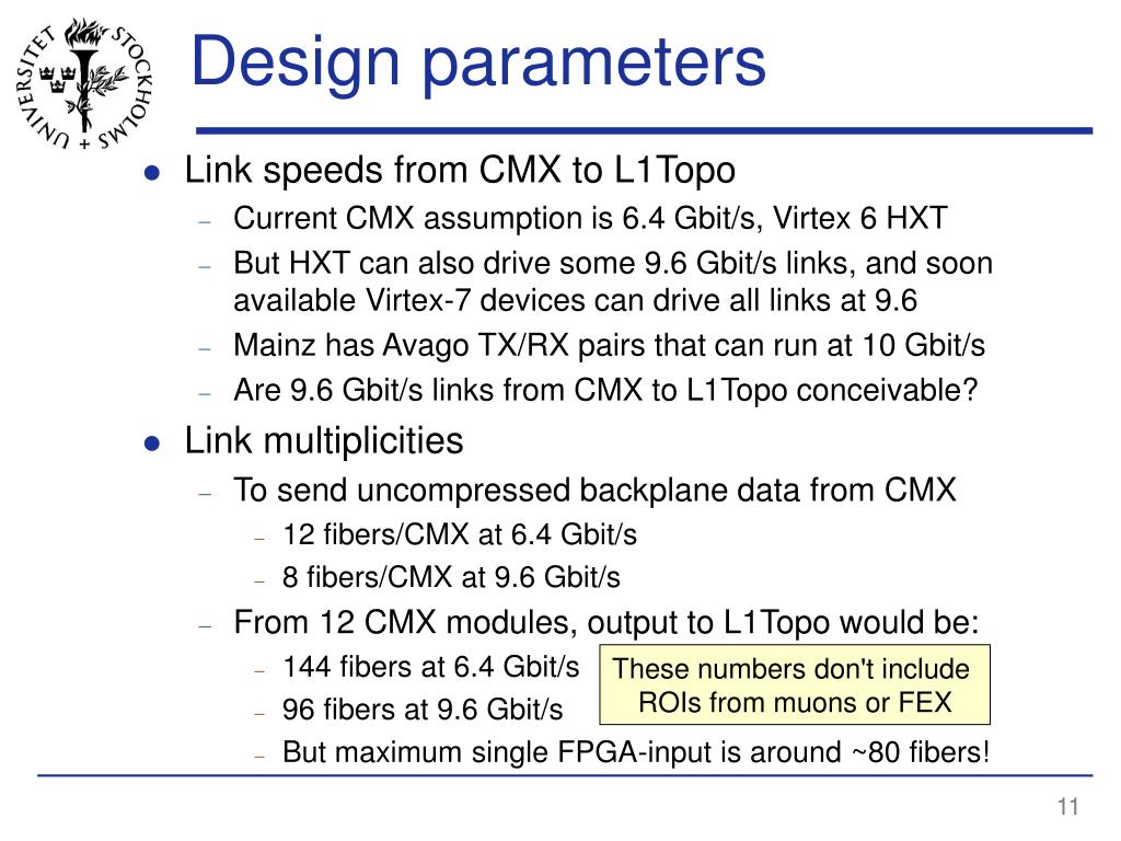 Design parameters • Link speeds from CMX to L1Topo • Current CMX assumption is 6.4 Gbit/s, Virtex 6 HXT • But HXT can also drive some 9.6 Gbit/s links, and soon available Virtex-7 devices can drive all links at 9.6 • Mainz has Avago TX/RX pairs that can run at 10 Gbit/s • Are 9.6 Gbit/s links from CMX to L1Topo conceivable? • Link multiplicities • To send uncompressed backplane data from CMX • 12 fibers/CMX at 6.4 Gbit/s • 8 fibers/CMX at 9.6 Gbit/s • From 12 CMX modules, output to L1Topo would be: • 144 fibers at 6.4 Gbit/s • 96 fibers at 9.6 Gbit/s • But maximum single FPGA-input is around ~80 fibers! These numbers don't include ROIs from muons or FEX